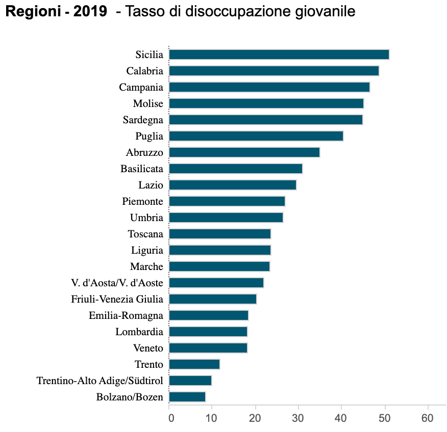 First, the labor market is particularly not equal when comparing the North to the South of Italy. Looking into Noi Italia, many statistics can be found confirming this notion. They stated that as of 2019, in the 20-64 age group, 7/10 people in the North of Italy were employed compared to the South of Italy, where only 5/10 people were employed. This statistic exemplifies an apparent disparity between the two regions. Furthermore, long-term unemployment is significantly higher in the southern regions. Long-term unemployment can be defined as an individual lacking a job for upwards of twelve months. The most surprising of all is the statistics surrounding youth unemployment. Youth are defined as ages 15-24 years old, and as shown in the graph below, the southern regions have much higher percentages of unemployment than the North. This age group is the nation’s future, and with the discrepancies, the inequalities will continue to persist in employment.